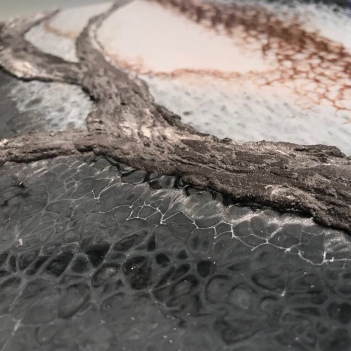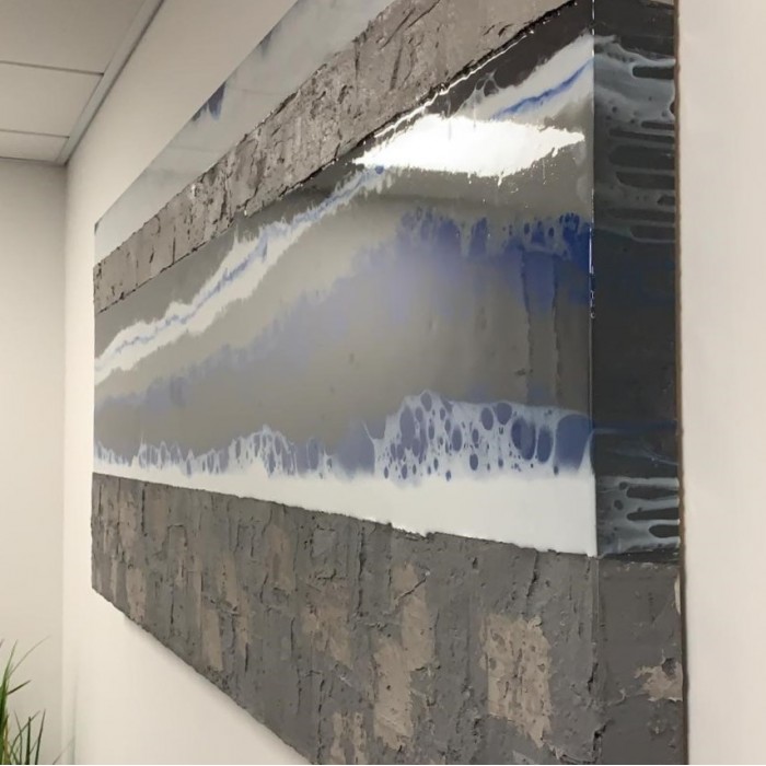 resi-CRETE offers the look and texture of traditional concrete but without the weight or brittleness of existing cementitous mortars. This material offers what liquid resins are unable to: depth, height, structure and control on sloped or vertical surfaces. It gives the user a quick, safe and easy method of creating depth, and thickness to control 3D height for art projects. resi-CRETE can be applied to most surfaces (canvas, wood, MDF, glass, steel, metals, stone, ceramic etc).